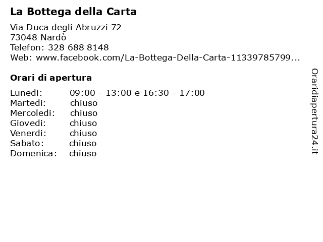 | Lunedi | 09:00-13:00 e 16:30-17:00 |