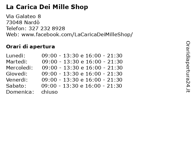 | Lunedi | 09:00-13:30 e 16:00-21:30 |