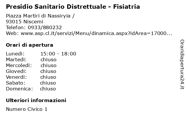 1 Presidio Sanitario Distrettuale - Punto Accoglienza (distanza: 0,00 km) Piazza Martiri di Nassiryia /, 93015 Niscemi accoglienza, ambulatorio, assistenza, cure mediche, distrettuale, presidio, punto, sanitario, sanità, servizi ai cittadini 2 Presidio Sanitario Distrettuale - Anagrafe (distanza: 0,00 km) Piazza Martiri di Nassiryia /, 93015 Niscemi ambulatorio, anagrafe, assistenza, cure mediche, distrettuale, presidio, sanitario, sanità, servizi ai cittadini 3 Presidio Sanitario Distrettuale - Rilascio Esenzione Ticket (distanza: 0,00 km) Piazza Martiri di Nassiryia /, 93015 Niscemi ambulatorio, assistenza, cure mediche, distrettuale, esenzione, presidio, rilascio, sanitario, sanità, servizi ai cittadini, ticket 4 Presidio Sanitario Distrettuale - Assistenza Sanitaria Diretta e Indiretta in Italia ed all'Estero (distanza: 0,00 km) Piazza Martiri di Nassiryia /, 93015 Niscemi all'estero, ambulatorio, assistenza, cure mediche, diretta, distrettuale, ed, in, indiretta, italia, presidio, sanitaria, sanitario, sanità, servizi ai cittadini 5 Presidio Sanitario Distrettuale - Serv. CEE (distanza: 0,00 km) Piazza Martiri di Nassiryia /, 93015 Niscemi ambulatorio, assistenza, cee, cure mediche, distrettuale, presidio, sanitario, sanità, serv., servizi ai cittadini 6 Presidio Sanitario Distrettuale - Protesi e Riabilitazione (distanza: 0,00 km) Piazza Martiri di Nassiryia /, 93015 Niscemi ambulatorio, assistenza, cure mediche, distrettuale, presidio, protesi, riabilitazione, sanitario, sanità, servizi ai cittadini |