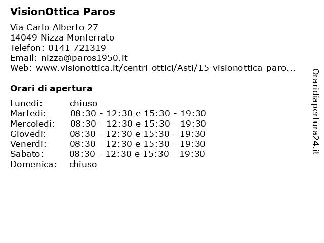 1 Paros Gioielleria (distanza: 8,21 km) Piazza Zoppa 8, 14053 Canelli acquisti, gioielleria, negozi, paros 3 Ottica Paros (distanza: 8,22 km) Piazza Zoppa Alessandro 9, 14053 Canelli occhiali, ottica, paros, sole, vista 4 VisionOttica Design Il Borgo (distanza: 18,80 km) Corso Casale 319, 14100 Asti borgo, design, ilborgo, ottica, vision, visionottica 5 Visionottica Boschis (distanza: 40,52 km) Via Vitt. Emanuele 253/255, 12042 Bra (CN) abbigliamento, boschis, cosmetici, profumo, scarpe, visionottica 6 Visionottica Almondo (distanza: 45,21 km) Via Vittorio Emanuele Ii 15, 12048 Sommariva del Bosco almondo, visionottica |