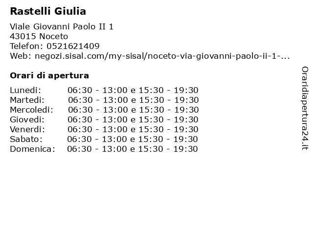| Lunedi | 06:30-13:00 e 15:30-19:30 |