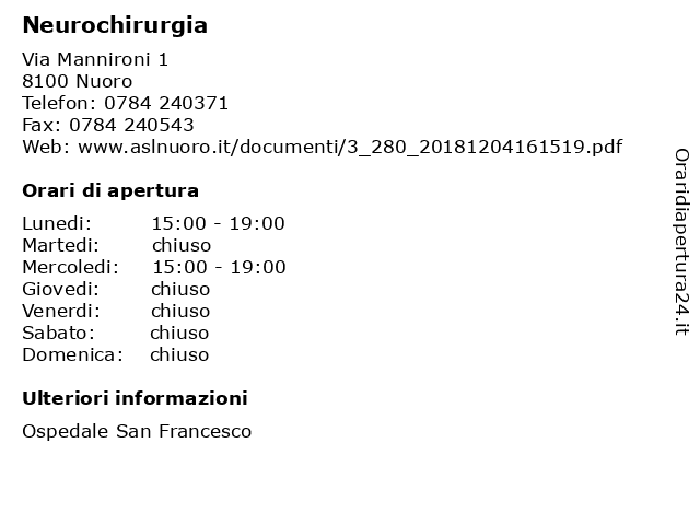 1 Ospedale San Francesco - Neurochirurgia: Visite ai Degenti (distanza: 0,24 km) Via Mannironi 2, 08100 Nuoro (NU) ai, cure mediche, degenti, dottore, francesco, medico, neurochirurgia, ospedale, prescrizioni farmaci, san, sanità, visite, visite mediche 2 Medicina Interna e Gastroentereologia (distanza: 0,00 km) Via Mannironi 1, 08100 Nuoro ambulatorio, assistenza sanitaria, gastroentereologia, interna, medicina, ospedale, visite mediche 3 Pediatria e Terapia Intensiva Neonatale (distanza: 0,00 km) Via Mannironi 1, 08100 Nuoro ambulatorio, assistenza sanitaria, intensiva, neonatale, pediatria, terapia, visite mediche 4 Ambulatorio M.O.C (distanza: 0,00 km) Via Mannironi 1, 08100 Nuoro ambulatorio, assistenza sanitaria, m.o.c, visite mediche 5 Otorinolaringoiatria (distanza: 0,00 km) Via Mannironi 1, 08100 Nuoro ambulatorio, assistenza sanitaria, otorinolaringoiatria, visite mediche 6 Urologia (distanza: 0,00 km) Via Mannironi 1, 08100 Nuoro ambulatorio, assistenza sanitaria, urologia, visite mediche |