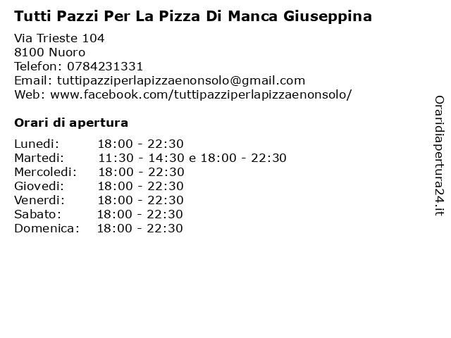 | Martedi | 11:30-14:30 e 18:00-22:30 |