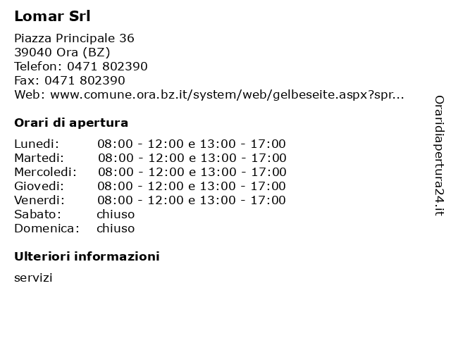 | Lunedi | 08:00-12:00 e 13:00-17:00 |