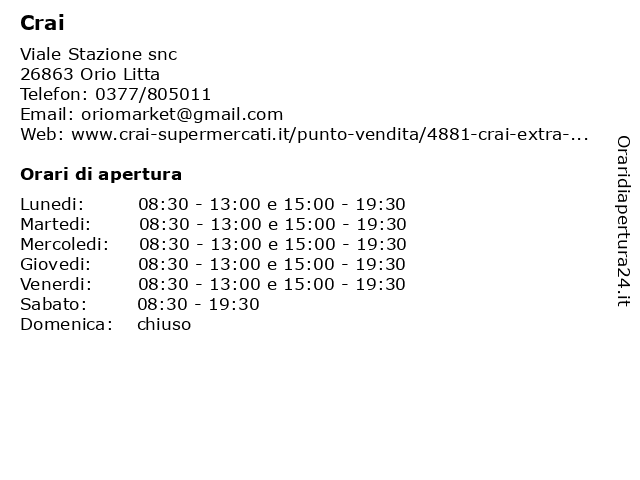1 Crai (distanza: 4,77 km) Via Garibaldi 255, 27013 Chignolo Po (orario, alimentari, crai, discount, invernale), spesa, supermercati, supermercato 2 Crai (distanza: 5,44 km) Via Pietro Nenni s.n.c., 26822 Brembio (LO) alimentare, crai, esercizio commerciale, negozio, supermarket, supermercato 3 Crai (distanza: 6,10 km) Viale Milano 13, 20078 San Colombano al Lambro (MI) (orario, alimenti, crai, invernale), ortofrutta, prodotti alimentari, prodotti freschi, prodotti surgelati, supermercato 4 Crai (distanza: 8,65 km) Piazza Della Chiesa s.n.c., 26816 Ossago Lodigiano crai, market, secugnago, super, supermercati 5 Crai (distanza: 12,39 km) Via Tobagi 47, 29010 Rottofreno alimentari, crai, discount, spesa, supermercati, supermercato 6 Crai (distanza: 14,37 km) Via Fiocchi 5, 27014 Corteolona E Genzone alimentari, carolo, comm, crai, dett, massimo, prod, vari |