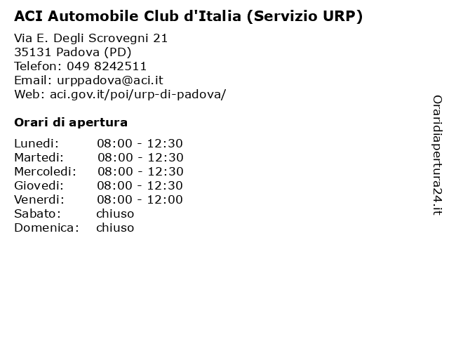 1 ACI Automobile Club d'Italia Servizio Pra (distanza: 0,00 km) Via E. Degli Scrovegni 21, 35131 Padova (PD) aci, assistenza accessori, assistenza bollo, assistenza medico-sanitaria, auto, auto sostitutiva, automobile, bollo, bollo sicuro, camper, club, d'italia, d'italia), driving, estero, pra, servizi, servizio 2 ACI Automobile Club d'Italia (distanza: 0,00 km) Via degli Scrovegni 21, 35131 Padova aci, auto, automobile, club, d'italia 4 URP Del MIUR (distanza: 1,43 km) Via Sanmicheli 2, 35100 Padova concorsi, del, famiglie, frequenza, istruzione, mensa e trasporti, miur, personale ata, scuola, spese, studenti, tasse scolastiche, università, urp 5 Catasto (Sede centrale - URP) (distanza: 1,67 km) Via Domenico Turazza 39, 35128 Padova (sede, catasto, centrale, planimetrie catastali, urp) 6 Aci - Automobile Club Padova (distanza: 4,60 km) Via S. Marco 214, 35129 Padova aci, automobile, club, padova |