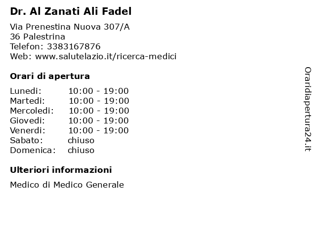 1 Dr. Al Zanati Ali Fadel (distanza: 11,63 km) Via Gaetano Donizetti snc, 00039 Zagarolo (RM) ali, ambulatori, analisi, cura della persona, cure, dr., fadel, medici, medicina, sanità, visite mediche, zanati 2 Maddo Ali Ali (distanza: 14,63 km) Via Tortorici 31, 00132 Roma ali, articoli, comm, dett, maddo, vari 3 Abou Ali Nadia (distanza: 14,94 km) Via Ariana 45, 00049 Velletri abou, ali, articoli, comm, dett, nadia, vari 4 Ali Khan Liaquat (distanza: 15,15 km) Via Mandas 13, 00132 Roma ali, articoli, comm, dett, khan, liaquat, vari 5 Ma.Ma.Ali (distanza: 16,21 km) Corso Filippo Turati 37, 00034 Colleferro abbigl, ali, comm, dett, donna, mazzocchitti, stefano 6 Kouadri Sid Ali (distanza: 16,45 km) Vicolo Bellonzi 10, 00049 Velletri ali, kouadri, porta, sid, telefoniche, vendite |