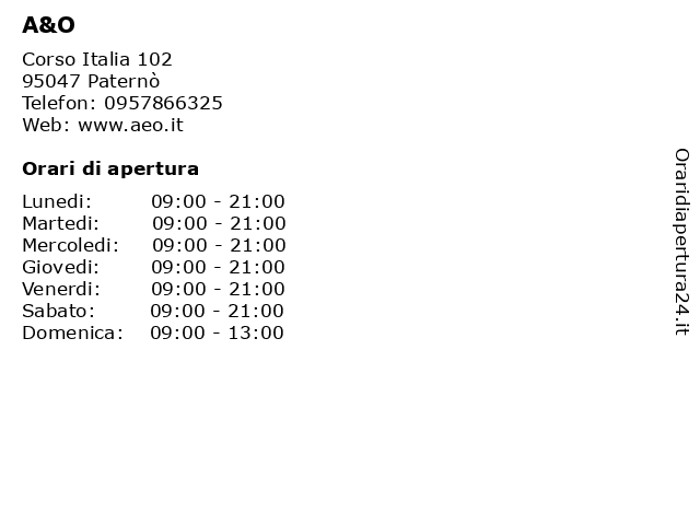1 A&O (distanza: 0,82 km) Via sardegna ang. Corso Sicilia 54, 95047 Paterṇ a&o, alimentazione, gastronomia, qualità 2 A&O (distanza: 13,04 km) Via Etnea 18, 95030 Gravina di Catania a&o, macelleria, ortofrutta, prodotti alimentari, qualità, supermercato, surgelati 3 A&O (distanza: 14,91 km) Via etnea 18, 95030 Gravina Di Catania a&o, alimentazione, gastronomia, qualità 5 A&O (distanza: 17,08 km) Via Morgione 47, 95027 S. Gregorio Di Catania a&o, alimentazione, gastronomia, qualità 6 A&O (distanza: 17,71 km) viale Vittorio veneto 60, 95100 Catania a&o, alimentazione, gastronomia, qualità |