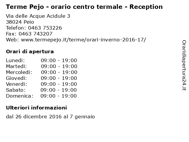 1 Terme Pejo - orario centro termale - Reception (distanza: 0,00 km) Via delle Acque Acidule 3, 38024 Peio centro, orario, pejo, reception, tempo libero, termale, terme, turismo 2 Terme di Pejo (Reception e Area Fitness (dal 27 giugno al 4 settembre 2016) (distanza: 0,00 km) Via delle Acque Acidule 3, 38024 Peio Fonti (TN) (dal, (reception, 2016), 27, al, area, di, fitness, giugno, pejo, servizi, settembre, terme, utente varie 3 Terme di Pejo (Reception e Area Fitness dal 5 settembre al 18 settembre ) (distanza: 0,00 km) Via delle Acque Acidule 3, 38024 Peio Fonti (TN) (dal, (domenica, (reception, 18, 2016, al, area, chiuso), dal, di, fitness, pejo, servizi, settembre, terme, utente varie 4 Terme di Pejo (cure termali dall’8 al 21 giugno 2015 domenica 14 giugno CHIUSO) (distanza: 0,00 km) Via delle Acque Acidule 3, 38024 Peio (cure, (oraricure, 14, 21, 2015, al, centro benessere, chiuso), dall’8, di, domenica, giugno, pejo, spa, termali, terme 5 Terme di Pejo (Centro Termale (dal 19 settembre all’8 ottobre 2016 (domenica 25 settembre e domenica 2 ottobre CHIUSO) (distanza: 0,00 km) Via delle Acque Acidule 3, 38024 Peio Fonti (TN) (centro, (dal, (domenica, 19, 25, 2016, all’8, chiuso), di, domenica, ottobre, pejo, servizi, settembre, termale, terme, utente varie 6 Terme di Pejo (Area Piscina (dal 19 settembre all’8 ottobre 2016 (domenica 25 settembre e domenica 2 ottobre CHIUSO) (distanza: 0,00 km) Via delle Acque Acidule 3, 38024 Peio Fonti (TN) (area, (dal, (domenica, 19, 25, 2016, all’8, chiuso), di, domenica, ottobre, pejo, piscina, servizi, settembre, terme, utente varie |