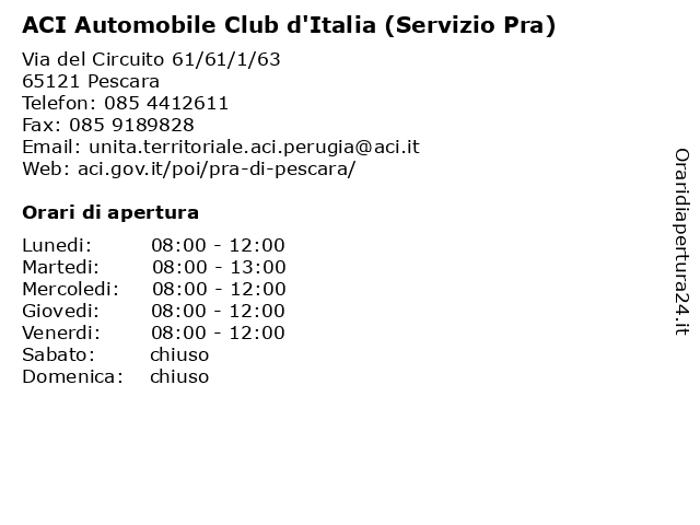 1 ACI Automobile Club d'Italia (Ufficio Tasse) (distanza: 0,00 km) Via del Circuito 61 - 61/1 - 63, 65121 Pescara (PE) (ufficio, aci, auto, automobile, club, d'italia, tasse) 2 ACI Automobile Club d'Italia (distanza: 0,03 km) Via del Circuito 51, 65121 Pescara aci, auto, automobile, club, d'italia 3 ACI Automobile Club d'Italia (Servizio URP) (distanza: 0,53 km) Via Del Circuito 61 - 61/1 - 63, 65121 Pescara (PE) (servizio, aci, auto, automobile, club, d'italia, urp) 4 ACI Automobile Club d'Italia (distanza: 1,16 km) Via Gabriele D’Annunzio 195, 65127 Pescara aci, auto, automobile, club, d'italia 5 ACI Automobile Club (distanza: 1,31 km) Viale G. Bovio 164, 65124 Pescara aci, assistenza stradale, associazione degli automobilisti, automobile, club, pratiche automobilistiche, riscossione tasse automobilistiche, servizi assicurativi 6 Delegazione ACI - Sara Assicurazioni La Pratica (distanza: 1,88 km) Via Colle Innamorati 7/4, 65125 Pescara aci, assicurazioni, azienda, cliente, delegazione, fabbrica, la, pratica, sara, vendita |