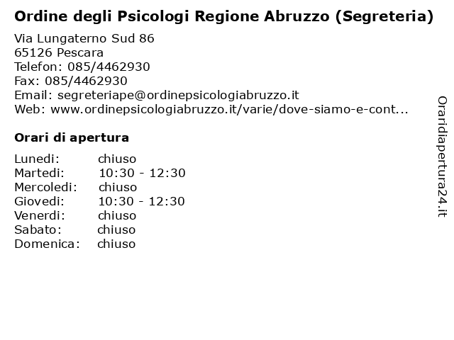 1 Ordine Degli Psicologi Della Regione Abruzzo - Sede amministrativa di Pescara (distanza: 0,04 km) Via Lungaterno Sud 86, 65126 Pescara abruzzo, amministrativa, degli, ordine, pescara, psicologi, regione, sede 2 Giovani Democratici Abruzzo (distanza: 0,06 km) Via Lungaterno Sud 76, 65126 Pescara abruzzo, azienda, cliente, democratici, fabbrica, giovani, vendita 3 Istituto Abruzzo e Molise Del Leasing Srl (distanza: 0,07 km) Piazza Della Marina 3, 65126 Pescara abruzzo, assic, finanz, immob, intermediaz, istituto, leasing, molise 4 Confcooperative Abruzzo (distanza: 0,20 km) Via Raffaele Paolucci 3, 65127 Pescara abruzzo, azienda, cliente, confcooperative, fabbrica, vendita 5 Agenzia per l'Abitare Abruzzo (distanza: 0,20 km) Via R.Paolucci 3, 65121 Pescara abruzzo, agenzia, azienda, cliente, fabbrica, l'abitare, per, vendita 6 Fiumare Abruzzo (distanza: 0,27 km) Lungofiume dei Poeti snc, 65100 Pescara abruzzo, escursioni turistiche, fiumare, servizio barca |