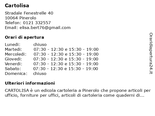 | Sabato | 07:30-12:30 e 15:30-19:00 |