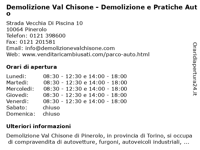 1 L'Eco del Chisone - Eco Extra - Cooperativa Cultura e Comunicazioni Sociali (distanza: 0,61 km) Viale i maggio 7, 10064 Pinerolo chisone, comunicazioni, cooperativa, cultura, del, eco, extra, l'eco, sociali 2 Demolizione val chisone (distanza: 5,63 km) Alcide De Gasperi 66, 10064 Pinerolo TO chisone, demolizione, demolizioni, ricambi usati, val 3 Demolizione Val Chisone (distanza: 5,63 km) Via De Gasperi 66, 10064 Pinerolo chisone, demolizione, negozio di ricambi per auto, val 4 Val Chisone Pensione (distanza: 7,73 km) Via Rivoira di Mezzo 11, 10060 San secondo di Pinerolo To chisone, pensione, peranimali, val 5 I Sapori Della Val Sangone Di Ame' Michela (distanza: 9,68 km) Piazza Martiri Iii Aprile 10, 10040 Cumiana ame, michela, pane, rivend, sangone, sapori, val 6 Torcitura Val Pellice Srl (distanza: 9,94 km) Via Daneo 8, 10060 Bricherasio assic, finanz, immob, intermediaz, pellice, torcitura, val |