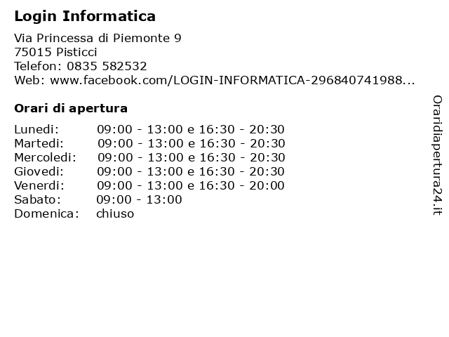 | Lunedi | 09:00-13:00 e 16:30-20:30 |