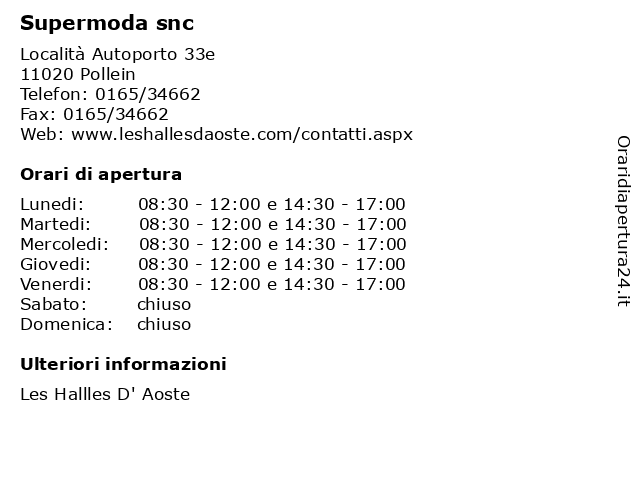 1 Supermoda Di Hu Jinyu e c. Snc (distanza: 0,16 km) Frazione Autoporto 14, 11020 Pollein comm, dett, hu, jinyu, scarpe, supermoda 2 Centro Odontoiatrico Perseo srl (distanza: 0,00 km) Località Autoporto 33e, 11020 Pollein centro, centro commerciale, odontoiatrico, perseo, servizi, srl 3 Desandre sas (distanza: 0,00 km) Località Autoporto 33e, 11020 Pollein centro commerciale, desandre, sas, servizi 4 Banca Commerciale Italiana (distanza: 11,17 km) Pza Emilio Chanoux 49, 11100 Aosta banca, banche, cassa, commerciale, credito, intesa, italiana, ordinario, risparmio, sanpaolo 5 Agraria Brescacin (distanza: 22,92 km) via Giordano Freydoz 19, 11020 Champdepraz agraria, brescacin, esercizio commerciale, ricettivo, struttura ricettiva 6 |