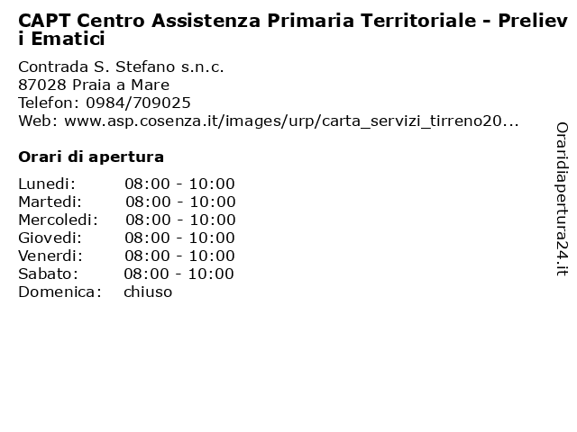 1 CAPT Centro Assistenza Primaria Territoriale - Ambulatorio Terapia del Dolore Dott. Greco F. (distanza: 0,00 km) Contrada S. Stefano s.n.c., 87028 Praia a Mare ambulatorio, assistenza, capt, centro, cure mediche, del, dolore, dott., f., greco, primaria, sanità, servizi ai cittadini, terapia, territoriale 2 Gas natural - Centro territoriale (distanza: 3,71 km) Via Notar G. Lomonaco 38, 87020 Aieta centro, corrente, energia, gas, metano, natural, territoriale 3 Servizio Prelievi (distanza: 10,20 km) Via San Nicola sn, 85046 Maratea ambulatorio, assistenza, cure mediche, prelievi, sanità, servizi ai cittadini, servizio 4 PST Polo Sanitario Territoriale - Prelievi Ematici (distanza: 10,78 km) Località Petrosa s.n.c., 87029 Scalea ambulatorio, assistenza, cure mediche, ematici, polo, prelievi, pst, sanitario, sanità, servizi ai cittadini, territoriale 5 Servizio Prelievi (distanza: 11,77 km) Via D.Pesce sn, 85049 Trecchina ambulatorio, assistenza, cure mediche, prelievi, sanità, servizi ai cittadini, servizio 6 Gas natural - Centro territoriale (distanza: 12,70 km) Via Togliatti, 20, 87029 Scalea centro, corrente, energia, gas, metano, natural, territoriale |