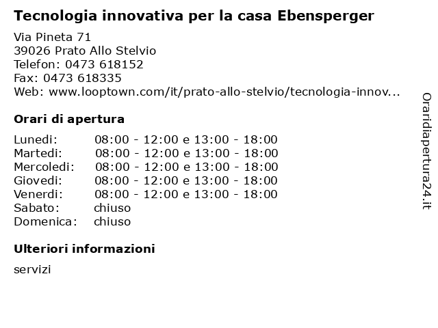 | 1 Ebensperger GmbH (distanza: 0,84 km) Via Kiefernhainweg 71, 39026 Prato allo Stelvio bar, club, ebensperger, gmbh, ristorante 2 Kuntner GmbH (distanza: 0,59 km) Via Kiefernhain 85, 39026 Prato allo Stelvio acqua, ambiente, gmbh, kuntner, riscaldamento, tecnologia 3 Supermedia (distanza: 54,82 km) Via Nazionale snc, 25048 Sonico elettrodomestici, elettronica, supermedia, tecnologia, tv 4 Vorwerk Point (distanza: 57,28 km) Via Nazionale 148, 23037 Villa Di Tirano (SO) elettrodomestici, elettronica, point, tecnologia, vorwerk 5 NOI Techpark (distanza: 59,34 km) Alessandro Volta Straße 9, 39100 Bolzano noi, servizi, techpark, tecnologia 6 Incubatore d’imprese di IDM (distanza: 59,34 km) Alessandro Volta Straße 9, 39100 Bolzano di, d’imprese, idm, incubatore, servizi, tecnologia |