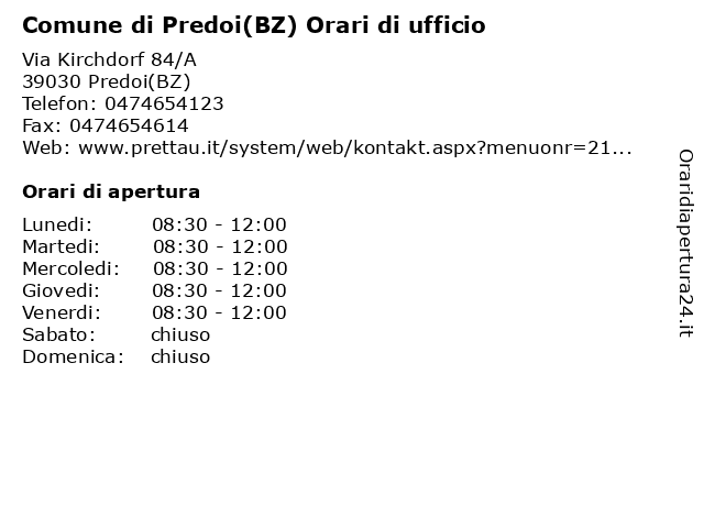 Tag di ricerca per Comune di Predoi(BZ) Orari di ufficio:di, orari, comunale, ufficio, servizio, comune, predoi(bz) |