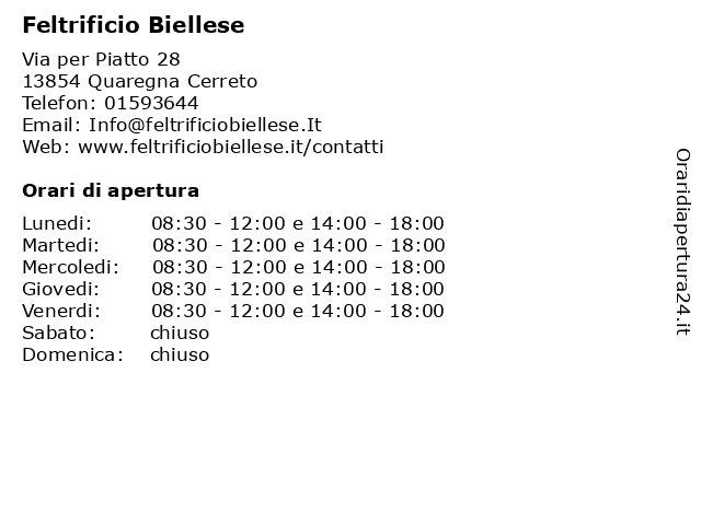 | Martedi | 08:30-12:00 e 14:00-18:00 |