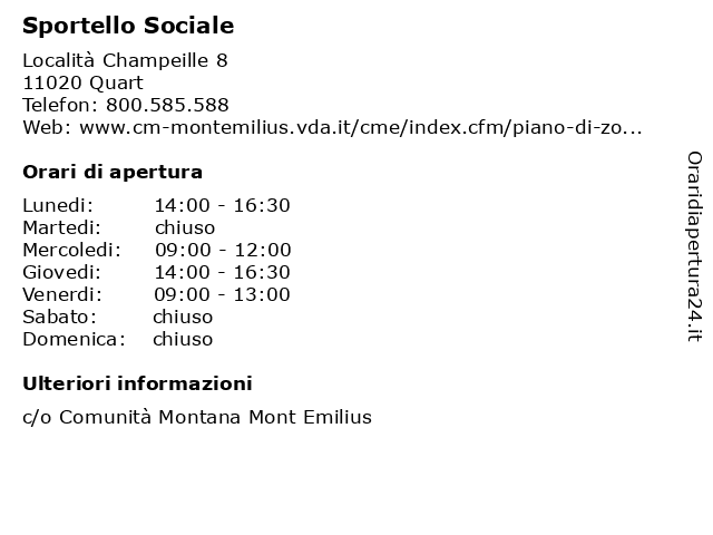 1 Sportello Sociale (distanza: 5,65 km) Piazza Chanoux 1, 11100 Aosta assistenza sociale, servizi sociali, servizio sociale, sociale, sportello, sportello sociale 2 Sportello Sociale (distanza: 6,74 km) Frazione Chez Roncoz 29/i, 11010 Gignod assistenza sociale, servizi sociali, servizio sociale, sociale, sportello, sportello sociale 3 Sportello Sociale (distanza: 15,16 km) Piazza Assunzione 18, 11018 Villeneuve assistenza sociale, servizi sociali, servizio sociale, sociale, sportello, sportello sociale 4 Struttura Operativa per l'Alta Valle - Front Office per le Attività Produttive (distanza: 0,16 km) Fraz. Petit Français 1, 11020 Quart (AO) attività, front, l'alta, le, office, operativa, per, produttive, sportello, struttura, unico, valle 5 Struttura Operativa Alta Valle - Front Office Edilizia, Territorio, Ambiente e Telecomunicazioni (distanza: 0,16 km) Fraz. Petit Français 1, 11020 Quart (AO) alta, ambiente, edilizia, front, office, operativa, sportello, struttura, telecomunicazioni, territorio, unico, valle 6 Comune di Quart (Assessore Istruzione Sanità e Politiche Sociali, Ambiente) (distanza: 2,06 km) Via Roma 1, 11020 Quart (AO) (assessore, ambiente, ambiente), assessore istruzione, comune, comune di quart, di, istruzione, politiche, politiche sociali, quart, sanità, sociali |