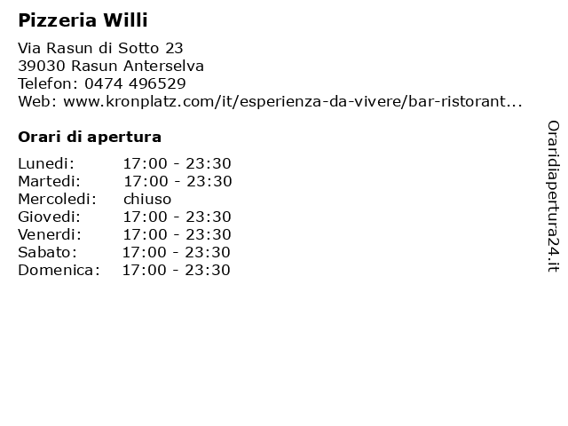 | Lunedi | 17:00-23:30 |