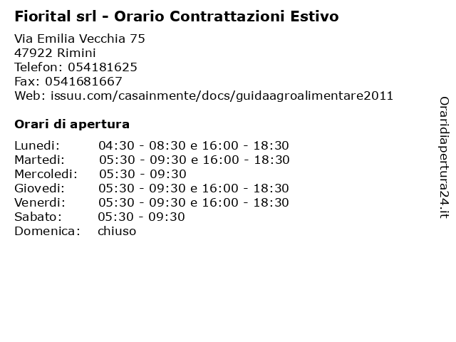 1 Fiorital srl - Orario Contrattazioni Invernale (distanza: 0,00 km) Via Emilia Vecchia 75, 47922 Rimini contrattazioni, fiorital, invernale, mercato ortofrutticolo, orario, ortofrutticolo, srl, verdure 2 Fiorital srl - Orario Vendita Pubblica Invernale (distanza: 0,00 km) Via Emilia Vecchia 75, 47922 Rimini fiorital, invernale, mercato ortofrutticolo, orario, ortofrutticolo, pubblica, srl, vendita, verdure 3 Fiorital srl - Orario Vendita Pubblica Estiva (distanza: 0,00 km) Via Emilia Vecchia 75, 47922 Rimini estiva, fiorital, mercato ortofrutticolo, orario, ortofrutticolo, pubblica, srl, vendita, verdure 4 Spador S.r.I. (Orario estivo inizio e fine contrattazioni ) (distanza: 0,00 km) Via Emilia Vecchia 75, 47923 Rimini (orario, contrattazioni, estivo, fine, ingrosso, inizio, mercato ittico, s.r.i., spador 5 Mare Chiaro S.r.l. (Orario estivo inizio e fine contrattazioni ) (distanza: 0,00 km) Via Emilia Vecchia 75, 47923 Rimini (orario, chiaro, contrattazioni, estivo, fine, ingrosso, inizio, mare, mercato ittico, s.r.l. 6 Fresh Service S.n.c..(Orario estivo inizio e fine contrattazioni ) (distanza: 0,00 km) Via Emilia Vecchia 75, 47923 Rimini contrattazioni, estivo, fine, fresh, ingrosso, inizio, mercato ittico, s.n.c..(orario, service |