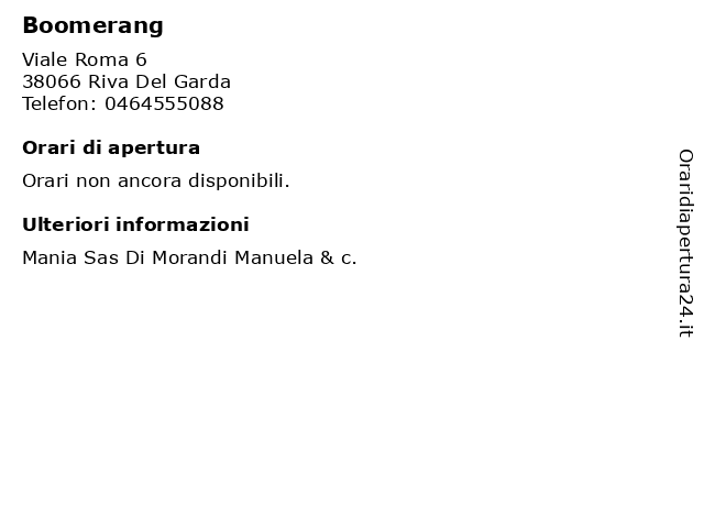 1 Boomerang (distanza: 13,68 km) Via Navene 19/c, 37018 Malcesine abbigl, boomerang, chesini, comm, dett, genere, teresa 2 Mania Abbigliamento Donna (distanza: 0,01 km) Viale Roma 6, 38066 Riva del Garda abbigliamento, donna, femminile, mania 3 Mania Sas Di Morandi Manuela & Co. (distanza: 0,02 km) Viale Dante 38, 38066 Riva Del Garda abbigl, comm, dett, genere, mania, manuela, morandi 4 Mania Snc Di Morandi Manuela & c. (distanza: 0,05 km) Viale Dante 26, 38066 Riva Del Garda abbigl, comm, dett, genere, mania, manuela, morandi 5 Mania Snc Di Morandi Manuela & c. (distanza: 1,47 km) Via Monte Misone 6, 38066 Riva Del Garda abbigl, comm, dett, genere, mania, manuela, morandi 6 Mania Snc Di Morandi Manuela & c. (distanza: 3,25 km) Via Santa Caterina 84, 38062 Arco abbigl, comm, dett, genere, mania, manuela, morandi |