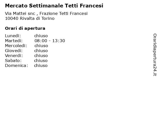 1 Istituto Comprensivo Tetti Francesi Rivalta di Torino (distanza: 0,14 km) Via Fossano 7, 10040 Rivalta di Torino comprensivo, di, francesi, istituto, istituto scolastico, rivalta, scuola, tetti, torino 2 Gruppo Anziani e Invalidi di Tetti Francesi Aps (distanza: 0,19 km) Via Fossano 11, 10040 Rivalta di Torino aiuto, anziani, aps, asd, associazione, cittadini, città, francesi, gruppo, insieme, invalidi, onlus, organizzazione, paese, società, tetti 3 GSD Tetti Francesi (distanza: 0,33 km) Via Pinerolo 38, 10040 Rivalta di Torino associazione, costituita, francesi, gsd, provincia, regolarmente, rivalta, tetti, torino 4 Mercato Settimanale Capoluogo (distanza: 3,17 km) Piazza Gerbidi snc, 10040 Rivalta di Torino all'aperto, capoluogo, mercati, mercato, rionale, settimanale 5 Mercato Settimanale (distanza: 3,17 km) Piazza San Amazio snc, 10040 Rivalta di Torino accessori, allestire, calzature, comunale, di paese, mercato, mercato cittadino, oggettistica, piazza, rionale, rivenditori, settimanale, vestiti 6 Mercato Settimanale (distanza: 5,17 km) Piazza Pertini snc, 10040 Volvera all'aperto, mercati, mercato, rionale, settimanale |