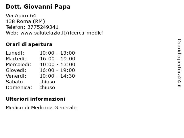 1 Dott. Papa Giovanni (distanza: 0,00 km) Via Apiro 64, 00138 Roma (RM) ambulatorio, cura della persona, dott., giovanni, medicina, medico, papa, prevenzione, salute 2 Parrocchia Sant'Innocenzo I Papa e San Guido Vescovo (distanza: 1,45 km) Via Radicofani 33, 00138 Roma chiesa, comunità, guido, organizzazione, papa, parrocchia, religiosa, san, sant'innocenzo, vescovo 3 2 a Service Snc Di Alessandro Del Papa (distanza: 2,14 km) Viale Lina Cavalieri 110, 00139 Roma alessandro, benzina, distributori, papa, service 4 G.d.p. 2001 Di Del Papa Giorgio (distanza: 4,23 km) Via Arturo Onofri 65, 00139 Roma 2001, accessori, auto, giorgio, papa, rivend 5 Animali ... Che Passione Di Nadia Papa Sas (distanza: 4,36 km) Via Val Pellice 35/37, 00141 Roma animali, articoli, che, comm, dett, nadia, papa, passione, vari 6 PAPA ALESSANDRO (Caf CGN spa) (distanza: 7,22 km) VIA A. SERPIERI 8, 00197 ROMA (caf, alessandro, caf, cgn, cigl, cisal, cisal srl, cisl, disoccupazione, domanda di disoccupazione, dopmanda, federazione, papa, patronato, pensionati, sedi caf, sindacato, spa) |