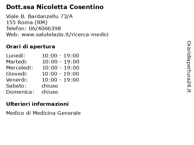 1 Dott.ssa Nicoletta Cosentino (distanza: 0,01 km) Viale Battista Bardanzellu 55, 00155 Roma (RM) ambulatori, analisi, cosentino, cura della persona, cure, dott.ssa, medici, medicina, nicoletta, sanità, visite mediche 3 Dr. Sergio Cosentino & Dr. Susanna Amato - Studio Di Ortodonzia ed Odontoiatria Infantile (distanza: 7,17 km) Via Angelo Secchi 3, 00197 Roma amato, cosentino, cure dentistiche, dentista, di, dr., ed, igiene dentale, implantologia, infantile, odontoiatria, ortodonzia, protesi, sergio, studio, susanna 4 Officina Romana Di Cristian Cosentino (distanza: 9,55 km) Via Di Vigna Stelluti 174, 00191 Roma abbigl, comm, cosentino, cristian, dett, genere, officina, romana 5 Cosentino Caterina (distanza: 9,94 km) Via Costantino Morin 12, 00195 Roma agenti, assicuraz, caterina, cosentino, serv 6 Cosentino Gerardo (distanza: 13,07 km) Via Ottavio Assarotti 46/b, 00135 Roma cosentino, gerardo, macellerie, pescherie, salumerie |