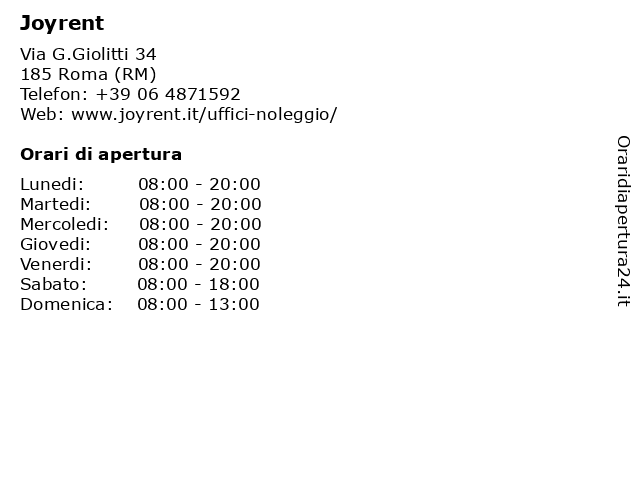 1 Joyrent (distanza: 4,41 km) Via Carlo Mirabello 39, 00195 Roma auto, autonoleggio, car, joyrent, noleggio, rent 2 Joyrent (distanza: 8,06 km) Viale Europa 321, 00144 Roma (RM) autonoleggio, joyrent, noleggio, noleggio auto, noleggio furgoni 3 Joyrent (distanza: 14,67 km) Via dei Laghi 2, 00043 Ciampino (RM) auto, autonoleggio, car, joyrent, noleggio, rent 4 Stazione di Noleggio - Ufficio (distanza: 0,00 km) Via Giolitti 34, 00185 Roma c.point, di, furgoni merci, noleggio, stazione, stazione noleggio, ufficio, ufficio per furgoni merci 5 Thrifty Car Rental (distanza: 0,00 km) Via Giolitti 34, 00185 Roma auto, car, furgoni, macchine, mobilità, noleggio, rental, thrifty, trasporto 6 Hertz (distanza: 0,54 km) Via Giolitti stazione Termini 34, 00185 Roma hertz, noleggio auto, noleggio furgoni |
