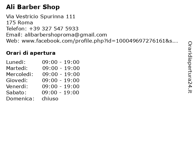 1 Ali Kamal (distanza: 0,10 km) Via Scribonio Curione 128, 00175 Roma ali, articoli, comm, dett, kamal, vari 2 Muhammad Ali (distanza: 0,16 km) Viale Dei Consoli 75-75 a, 00175 Roma ali, alimentari, comm, dett, muhammad, prod, vari 4 Mustacchio Barber & Tattoo Shop (distanza: 0,23 km) Viale Dei Consoli 121/123, 00175 Roma (RM) barber, belleza, dream, hair, mustacchio, parrucchieri, salud, shop, spa, tattoo 6 Ali Mohammad (distanza: 0,75 km) Via Cincinnato 64/a, 00175 Roma ali, mohammad, porta, telefoniche, vendite |