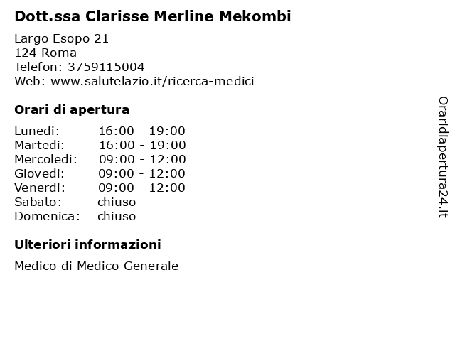 1 Dott.ssa Clarisse Merline Mekombi (distanza: 3,28 km) Via Cesare Maccari 196, 00125 Roma (RM) ambulatori, analisi, clarisse, cura della persona, cure, dott.ssa, medici, medicina, mekombi, merline, sanità, visite mediche 2 Relais Le Clarisse (distanza: 18,98 km) Via Cardinale Merry del Val 20, 00153 Roma albergo, camere, clarisse, le, pernottamenti, relais, vacanze 3 Hotel Le Clarisse al Pantheon (distanza: 20,07 km) Via dell'Arco della Ciambella 19, 00186 Roma (RM) al, albergo, camere, clarisse, dormire, hotel, le, pantheon, pernottamenti, vacanze 4 Dott.ssa Elena Grab (distanza: 0,00 km) Largo Esopo 21A, 00124 Roma ambulatori, analisi, cura della persona, cure, dott.ssa, elena, grab, medici, medicina, sanità, visite mediche 5 Dr.ssa VECCHIOLI ANITA (distanza: 0,04 km) L.go Esopo 9, 00124 Roma (RM) ambulatori, anita, circoscrizione, dottore, dr.ssa, guarigione, medico di base, medico di famiglia, pediatra, studi, vecchioli, visita 6 Dr. MAURO ALDO (distanza: 0,19 km) Via Timocle 66, 00124 Roma (RM) aldo, ambulatori, circoscrizione, dottore, dr., guarigione, mauro, medico di base, medico di famiglia, pediatra, studi, visita |