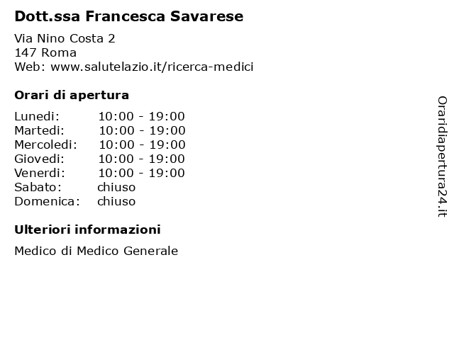 1 Dott.ssa Francesca Savarese (distanza: 1,93 km) Viale Leonardo Da Vinci 183, 00145 Roma (RM) ambulatori, analisi, cura della persona, cure, dott.ssa, francesca, medici, medicina, sanità, savarese, visite mediche 2 UCP Unità di Cure Primarie - Dott. Alberto Savarese (distanza: 1,79 km) Via Castelmonte 12, 00142 Roma (RM) alberto, cure, cure mediche, di, dott., dottore, medico, prescrizioni farmaci, primarie, sanità, savarese, ucp, unità, visite mediche 3 Mille Carezze Sas Di Savarese Davide & c. (distanza: 3,68 km) Via Lugnano In Teverina 18, 00181 Roma abbigl, carezze, comm, davide, dett, genere, mille, savarese 4 Studio Dentistico Savarese (distanza: 7,02 km) Via Dei Gracchi 91, 00192 Roma cura denti, dentista, dentistico, odontoiatra, savarese, studio, studio dentistico 5 Dott. Nicola Savarese Nutrizionista (distanza: 7,28 km) Via Pasquale Stanislao Mancini 2, 00196 Roma azienda, cliente, dott., fabbrica, nicola, nutrizionista, savarese, vendita 6 Savarese Luca (distanza: 8,49 km) Via Aurelia 567, 00165 Roma catalogo, corrispond, luca, savarese, vendite |