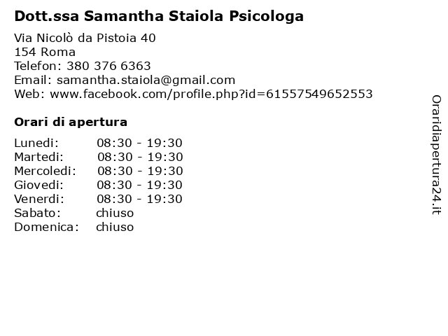 1 Dott.ssa Chiara Gaggi - Psicologa, Psicoterapeuta (distanza: 0,19 km) Via Gaetano Casati 39, 00154 Roma chiara, dott.ssa, gaggi, psicologa, psicologia, psicologo, psicoterapeuta, psicoterapia, specialista 2 Psicologa Alessandra Spennato (distanza: 0,24 km) Piazza Biffi s.n.c, 00154 Roma alessandra, alessandra spennato, psicologa, psicoterapeuta cognitivo-comportamentale, spennato, terapeuta emdr 3 Federica Leoni - Psicologa Clinica Psicologa On-line (distanza: 1,30 km) Via Emmanouil Veisaki snc, 00145 Roma clinica, federica, leoni, line, on, on-line, psicologa, terapia 4 Manuela Marangio Psicologa (distanza: 1,54 km) Via Tiberio Imperatore 15, 00145 Roma manuela, marangio, psicologa, roma 5 Chiara Longo Psicologa Psicoterapeuta (distanza: 1,75 km) Viale Largo Luigi Antonelli 14, 00145 Roma chiara, chiara longo, longo, psicologa, psicoterapeuta, psicoterapia cognitiva-costruttivista 6 Dott.ssa Barbara Cimirro Psicologa Psicoterapeuta Bioenergetica (distanza: 2,50 km) Via Pomezia 9, 00183 Roma adolescenti, adulti, barbara, bioenergetica, cimirro, consulenza psicologica, coppie, dott.ssa, famiglie, psicodiagnosta, psicologa, psicologo, psicoterapeuta |