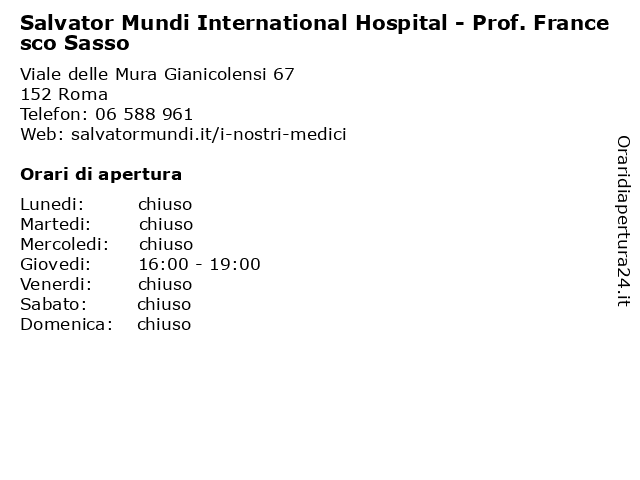 1 Salvator Mundi International Hospital - Dott. Christian Abi Nassif (distanza: 0,00 km) Viale delle Mura Gianicolensi 67, 00152 Roma abi, christian, cure mediche, dott., dottore, hospital, international, medico, mundi, nassif, prescrizioni farmaci, salvator, sanità, visite mediche 2 Salvator Mundi International Hospital - Prof. Giuseppe Maria Ettorre (distanza: 0,00 km) Viale delle Mura Gianicolensi 67, 00152 Roma cure mediche, dottore, ettorre, giuseppe, hospital, international, maria, medico, mundi, prescrizioni farmaci, prof., salvator, sanità, visite mediche 3 Salvator Mundi International Hospital - Prof. Fabio Calabrò (distanza: 0,00 km) Viale delle Mura Gianicolensi 67, 00152 Roma calabrò, cure mediche, dottore, fabio, hospital, international, medico, mundi, prescrizioni farmaci, prof., salvator, sanità, visite mediche 4 Salvator Mundi International Hospital - Dott. Luca Ferrara (distanza: 0,00 km) Viale delle Mura Gianicolensi 67, 00152 Roma cure mediche, dott., dottore, ferrara, hospital, international, luca, medico, mundi, prescrizioni farmaci, salvator, sanità, visite mediche 5 Salvator Mundi International Hospital - Dott. Franco Berti (distanza: 0,00 km) Viale delle Mura Gianicolensi 67, 00152 Roma berti, cure mediche, dott., dottore, franco, hospital, international, medico, mundi, prescrizioni farmaci, salvator, sanità, visite mediche 6 Salvator Mundi International Hospital - Prof. Stefano Bottari (distanza: 0,00 km) Viale delle Mura Gianicolensi 67, 00152 Roma bottari, cure mediche, dottore, hospital, international, medico, mundi, prescrizioni farmaci, prof., salvator, sanità, stefano, visite mediche |