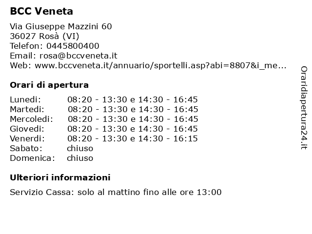 1 BCC Veneta (distanza: 5,26 km) Viale A. De Gasperi 1, 36061 Bassano del Grappa banca, bancario, banche, banking, bcc, veneta, verona, vicenza 2 BCC Veneta (distanza: 5,54 km) Viale Venezia 26, 36022 Cassola banca, bcc, conto corrente, mutuo, prelievi, prestiti, veneta, versamenti 3 BCC Veneta (distanza: 5,87 km) Via della Repubblica 3, 36056 Tezze sul Brenta banca, bcc, conto corrente, mutuo, prelievi, prestiti, veneta, versamenti 4 BCC Veneta (distanza: 8,70 km) Viale Stazione 40, 36063 Marostica banca, bancario, banche, banking, bcc, veneta, verona, vicenza 5 BCC Veneta (distanza: 11,23 km) Via Ponticello 48, 36064 Colceresa (VI) assegni, banca, bcc, conto corrente, denaro, veneta, verona, versamenti, vicenza 6 BCC Veneta (distanza: 13,97 km) Via Perlena 106, 36030 Fara Vicentino (VI) banca, bcc, conto corrente, mutuo, prelievi, prestiti, veneta, versamenti |