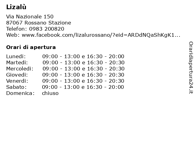| Sabato | 09:00-13:00 e 16:30-20:00 |