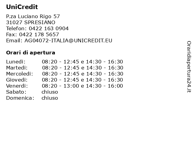 1 Unicredit (distanza: 7,70 km) VIA SOLFERINO 5/3, 31050 VILLORBA assicurazione per la casa, assicurazione per la persona, banca, bancomat, carta prepagata, conto, creditexpress dynamic, finanziamenti, genius first, genius smart, investimenti, mutui, prestiti personali, super genius 2.0, unicredit, unicreditcard click, unicreditcard flexia classic 3 Unicredit (distanza: 10,65 km) Via Schiavonesca Nuova 139, 31040 Volpago del Montello assicurazione per la casa, assicurazione per la persona, banca, bancomat, carta prepagata, conto, creditexpress dynamic, finanziamenti, genius first, genius smart, investimenti, mutui, prestiti personali, super genius 2.0, unicredit, unicreditcard click, unicreditcard flexia classic 4 Unicredit (distanza: 11,25 km) VIA E DELLA REPUBBLICA 197, 31100 TREVISO assicurazione per la casa, assicurazione per la persona, banca, bancomat, carta prepagata, conto, creditexpress dynamic, finanziamenti, genius first, genius smart, investimenti, mutui, prestiti personali, super genius 2.0, unicredit, unicreditcard click, unicreditcard flexia classic 6 Unicredit (distanza: 12,42 km) Via Feltrina 44, 31040 Signoressa di Trevignano assicurazione per la casa, assicurazione per la persona, banca, bancomat, carta prepagata, conto, creditexpress dynamic, finanziamenti, genius first, genius smart, investimenti, mutui, prestiti personali, super genius 2.0, unicredit, unicreditcard click, unicreditcard flexia classic |