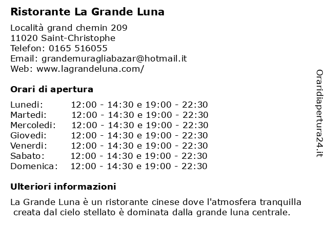 1 Ristorante Cinese La Grande Luna (distanza: 0,56 km) Località Grand Chemin 75, 11020 Saint-Christophe abbigliamento, affar, bellezza, cinese, dessert, grande, la, luna, moda, ristorante, vendite 2 Grande Muraglia Bazar Di Chen Fangjing e c. Sas (distanza: 1,00 km) Localita' Amerique 127, 11020 Quart articoli, bazar, chen, comm, dett, fangjing, grande, muraglia, vari 3 Dott. Meneghini Luna (distanza: 1,45 km) Località Amérique 19, 11020 Quart ambulatorio, cura della persona, dott., luna, medicina, medico, meneghini, prevenzione, salute 4 Luna Sas Di Lunardi Stefano (distanza: 3,02 km) Via Monsignore De Sales 14, 11100 Aosta caseari, latterie, luna, lunardi, prodotti, stefano 6 Luna Park (distanza: 4,04 km) Corso Battaglione s.n.c, 11100 Aosta attrazioni, divertimento, giostre, luna, parco, park |