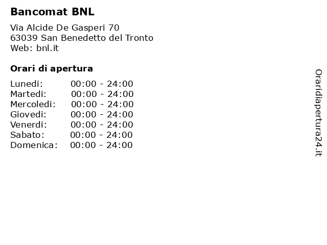 1 Bancomat BNL (distanza: 7,00 km) S.S. Adriatica Via Monti Della Laga snc, 63039 San Benedetto del Tronto (AP) banca, bancomat, bnl, pagamenti, prelievi, soldi, versamenti 2 Bancomat BNL (distanza: 15,18 km) Via Salaria 29, 63036 Spinetoli banca, bancomat, bnl, pagamenti, prelievi, soldi, versamenti 3 Bancomat BNL (distanza: 15,18 km) Via Salaria 29, 63036 Spinetoli banca, bancomat, bnl, pagamenti, prelievi, soldi, versamenti 4 Banca Nazionale Del Lavoro Spa In Forma Contratta Bnl Spa (distanza: 3,54 km) Via Francesco Crispi 2/a, 63074 San Benedetto Del Tronto banca, banche, bnl, cassa, contratta, credito, forma, lavoro, nazionale, ordinario, risparmio, spa 5 Banca del Piceno (distanza: 3,46 km) Via A. Gramsci 29, 63039 San Benedetto del Tronto banca, bancomat, bnl, del, pagamenti, piceno, prelievi, soldi, versamenti 6 Banca Nazionale Del Lavoro Spa In Forma Contratta Bnl Spa (distanza: 21,25 km) Via Fratelli Rosselli 7, 63822 Porto San Giorgio banca, banche, bnl, cassa, contratta, credito, forma, lavoro, nazionale, ordinario, risparmio, spa |