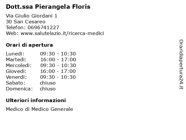 1 Dott.ssa Pierangela Floris (distanza: 0,12 km) Via Giulio Giordani 10, 00030 San Cesareo (RM) ambulatori, analisi, cura della persona, cure, dott.ssa, floris, medici, medicina, pierangela, sanità, visite mediche 2 ONORANZE FUNEBRI FLORIS ARTE (distanza: 19,92 km) Via Consolare Latina 35, 00034 Colleferro(RM) arte, cremazioni, floris, funebri, onoranze, onoranze funebri, trasporti funebri, tumulazioni 3 Floris Srl (distanza: 22,03 km) Via dei Ranuncoli 60, 00134 Santa Palomba 'azienda, collaboration, communication, floris, lazio, srl 4 La Giostra Dei Bimbi Di Floris Tiziana (distanza: 23,10 km) Via Roberto Malatesta 60, 00176 Roma abbigl, bambini, bimbi, comm, dett, floris, giostra, tiziana 5 Brisco Food Sas Di Francesco Floris e c. (distanza: 26,31 km) Via Marcello Malpighi 11, 00161 Roma bar, birrerie, brisco, floris, food, francesco, paninoteche 6 Studio Floris s.r.l.s. (distanza: 28,44 km) Via Gianmaria Volonte' 4, 07024 La Maddalena assic, finanz, floris, immob, intermediaz, studio |