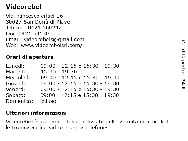 | Lunedi | 09:00-12:15 e 15:30-19:30 |
