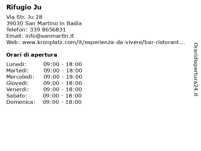 1 Rifugio Ju (Ristorante) (distanza: 0,00 km) Via Str. Ju 28, 39030 San Martino in Badia (ristorante), bar, bere, caffetteria, ju, locale, mangiare, rifugio, ristorante, stuzzicheria 2 Rifugio Montemuro (distanza: 4,77 km) Via Str. Börz 19, San Martino in Badia, 39030 Antermoia bar, bere, caffetteria, locale, mangiare, montemuro, rifugio, ristorante, stuzzicheria 4 Rifugio Graziani Hütte (distanza: 5,40 km) Strada Furcia 33, 39030 Marebbe b&b, graziani, hotel, hütte, rifugio 5 Rifugio Geiselsberger - Ristorante (distanza: 9,27 km) Località Plan de Corones snc, pista Plateau, 39030 Sorafurcia bar, bere, caffetteria, geiselsberger, locale, mangiare, rifugio, ristorante, stuzzicheria 6 Rifugio Scotoni Hutte (distanza: 9,93 km) Località Alpe Lagazuoi snc, 39036 Badia club, hutte, pizzeria. bar, rifugio, ristorante, scotoni |