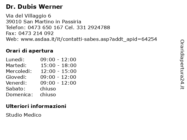 1 Dott. Dubis Werner (distanza: 0,47 km) Via Paese 6, 390130 S. Martino - Passiria ambulatorio, dott., dubis, medicina, medico, medico di famiglia, pediatra, sanità, studio medico, visite, werner 2 Burggraefler Snc Di Niederkofler Werner & Daporta Harald (distanza: 3,68 km) Via Passiria 13, 39015 San Leonardo In Passiria agenti, assicuraz, burggraefler, daporta, harald, niederkofler, serv, werner 3 Kneissl Werner (distanza: 8,82 km) Localita' Paese 69/2, 39013 Moso In Passiria agenti, assicuraz, kneissl, serv, werner 4 Kuckuck Snc Di Werner Schadler & Co. (distanza: 11,66 km) Via Principale 23/g, 39019 Tirolo art, comm, dett, kuckuck, regalo, schadler, souvenir, werner 5 Kuckuck Snc Di Werner Schadler & c. (distanza: 11,70 km) Via Principale 30/c, 39019 Tirolo art, comm, dett, kuckuck, regalo, schadler, souvenir, werner 6 Drescher Foto Souvenir Des Drescher Werner (distanza: 13,39 km) Passeggiata d' Inverno 3, 39012 Merano articoli, comm, des, dett, drescher, foto, souvenir, vari, werner |