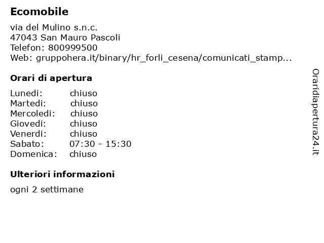 1 Ecomobile (distanza: 0,00 km) via del Mulino s.n.c., 47043 San Mauro Pascoli comune, ecomobile, servizi 3 Ecomobile (distanza: 7,14 km) Via Canale Bonificazione s.n.c., 47042 Cesenatico comune, ecomobile, servizi 6 |