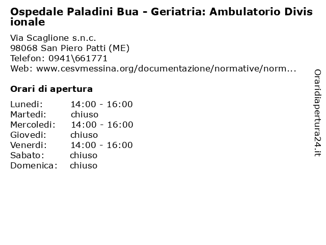 1 Ospedale Paladini Bua - Pronto Soccorso (distanza: 0,00 km) Via Scaglione s.n.c., 98068 San Piero Patti (ME) ambulatorio, assistenza, bua, cure mediche, ospedale, paladini, pronto, sanità, servizi ai cittadini, soccorso 2 Ospedale Paladini Bua - Dirigente Sanitario (distanza: 0,00 km) Via Scaglione s.n.c., 98068 San Piero Patti (ME) ambulatorio, assistenza, bua, cure mediche, dirigente, ospedale, paladini, sanitario, sanità, servizi ai cittadini 3 Ospedale Paladini Bua - Rilascio Cartelle Cliniche e Certificati (distanza: 0,00 km) Via Scaglione s.n.c., 98068 San Piero Patti (ME) ambulatorio, assistenza, bua, cartelle, certificati, cliniche, cure mediche, ospedale, paladini, rilascio, sanità, servizi ai cittadini 4 Ospedale Paladini Bua - Ufficio Prenotazioni Prestazioni (distanza: 0,00 km) Via Scaglione s.n.c., 98068 San Piero Patti (ME) ambulatorio, assistenza, bua, cure mediche, ospedale, paladini, prenotazioni, prestazioni, sanità, servizi ai cittadini, ufficio 5 Ospedale Paladini Bua - Ufficio Pagamento Ticket (distanza: 0,00 km) Via Scaglione s.n.c., 98068 San Piero Patti (ME) ambulatorio, assistenza, bua, cure mediche, ospedale, pagamento, paladini, sanità, servizi ai cittadini, ticket, ufficio 6 Ospedale Paladini Bua - Servizio Accettazione (distanza: 0,00 km) Via Scaglione s.n.c., 98068 San Piero Patti (ME) accettazione, ambulatorio, assistenza, bua, cure mediche, ospedale, paladini, sanità, servizi ai cittadini, servizio  |