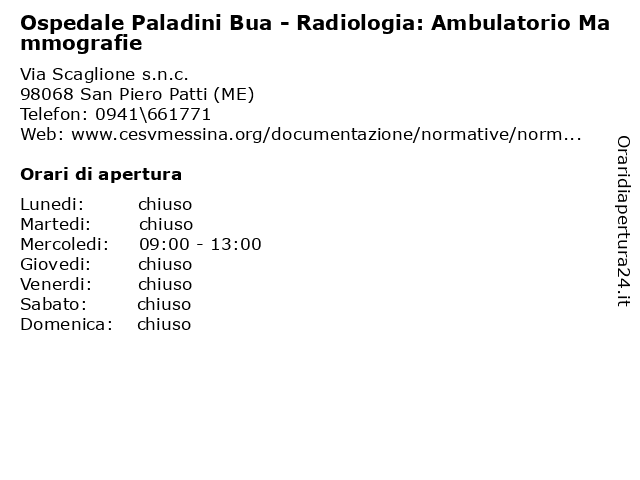| 1 Ospedale Paladini Bua - Pronto Soccorso (distanza: 0,00 km) Via Scaglione s.n.c., 98068 San Piero Patti (ME) ambulatorio, assistenza, bua, cure mediche, ospedale, paladini, pronto, sanità, servizi ai cittadini, soccorso 2 Ospedale Paladini Bua - Dirigente Sanitario (distanza: 0,00 km) Via Scaglione s.n.c., 98068 San Piero Patti (ME) ambulatorio, assistenza, bua, cure mediche, dirigente, ospedale, paladini, sanitario, sanità, servizi ai cittadini 3 Ospedale Paladini Bua - Rilascio Cartelle Cliniche e Certificati (distanza: 0,00 km) Via Scaglione s.n.c., 98068 San Piero Patti (ME) ambulatorio, assistenza, bua, cartelle, certificati, cliniche, cure mediche, ospedale, paladini, rilascio, sanità, servizi ai cittadini 4 Ospedale Paladini Bua - Ufficio Prenotazioni Prestazioni (distanza: 0,00 km) Via Scaglione s.n.c., 98068 San Piero Patti (ME) ambulatorio, assistenza, bua, cure mediche, ospedale, paladini, prenotazioni, prestazioni, sanità, servizi ai cittadini, ufficio 5 Ospedale Paladini Bua - Ufficio Pagamento Ticket (distanza: 0,00 km) Via Scaglione s.n.c., 98068 San Piero Patti (ME) ambulatorio, assistenza, bua, cure mediche, ospedale, pagamento, paladini, sanità, servizi ai cittadini, ticket, ufficio 6 Ospedale Paladini Bua - Servizio Accettazione (distanza: 0,00 km) Via Scaglione s.n.c., 98068 San Piero Patti (ME) accettazione, ambulatorio, assistenza, bua, cure mediche, ospedale, paladini, sanità, servizi ai cittadini, servizio |