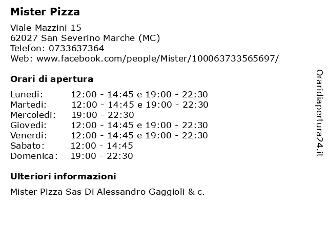 | Lunedi | 12:00-14:45 e 19:00-22:30 |