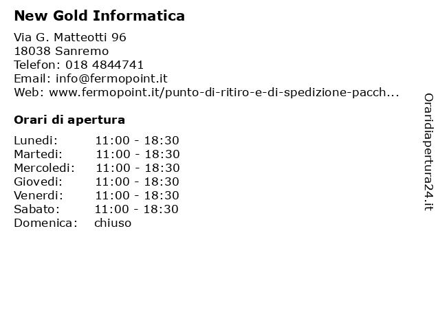 1 Agenzia Immobiliare RE/MAX Gold Casinò Sanremo (distanza: 0,09 km) Via Francesco Corradi 21, 18038 Sanremo agenzia, casinò, gold, immobiliare, re/max, sanremo 2 Gt Gold (distanza: 0,13 km) Via Feraldi 25, 18038 Sanremo acquisti, compra vendita oro, convenienza, gioielli, gold, gt, negozi, shopping 3 Enigma Informatica (distanza: 0,14 km) Piazza Eroi Sanremesi 26/6, 18038 San Remo azienda, computer, enigma, informatica, programmazione, riparazione 4 Ermes Informatica Srl (distanza: 0,59 km) Corso Orazio Raimondo 79/83, 18038 Sanremo comm, dett, ermes, fi, hi, informatica, radio, televisione 5 Ermes Informatica (distanza: 0,59 km) Corso Orazio Raimondo 83, 18038 Sanremo computer, elettronica, ermes, informatica 6 INTERNET POINT GOLD DI MAURIZIO NORSCIA (distanza: 8,99 km) Via Nino Bixio 51, 18015 Riva Ligure banche, carta prepagata my wu, conto bancario, di, gold, incassare denaro, internet, inviare denaro online, maurizio, mobile money transfer, money transfer, my wu, norscia, pagamenti internazionali, pagamento cash, pagamento online, point, quick pay, ricevere denaro, spedire denaro |